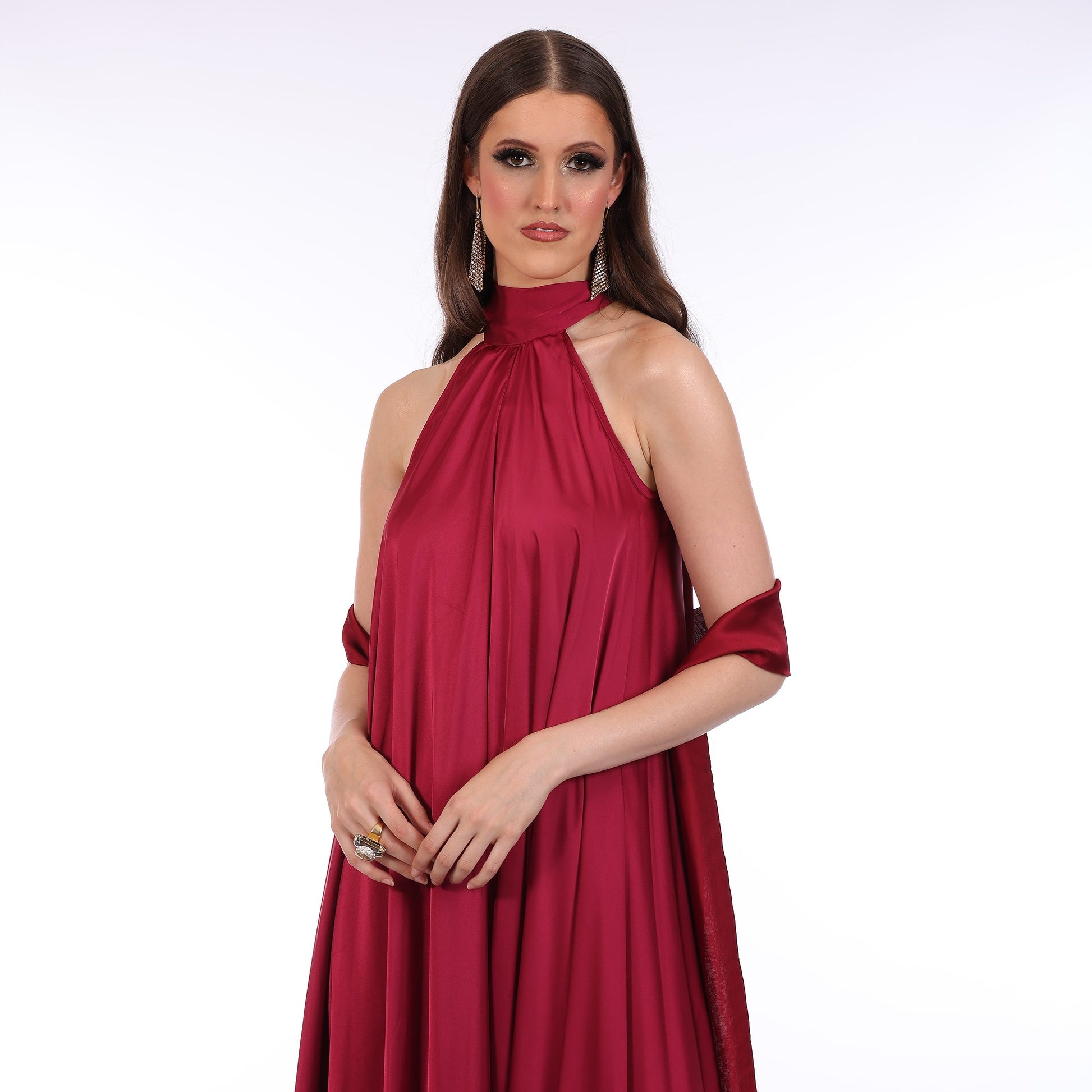 Can be worn multiple ways with satin belt