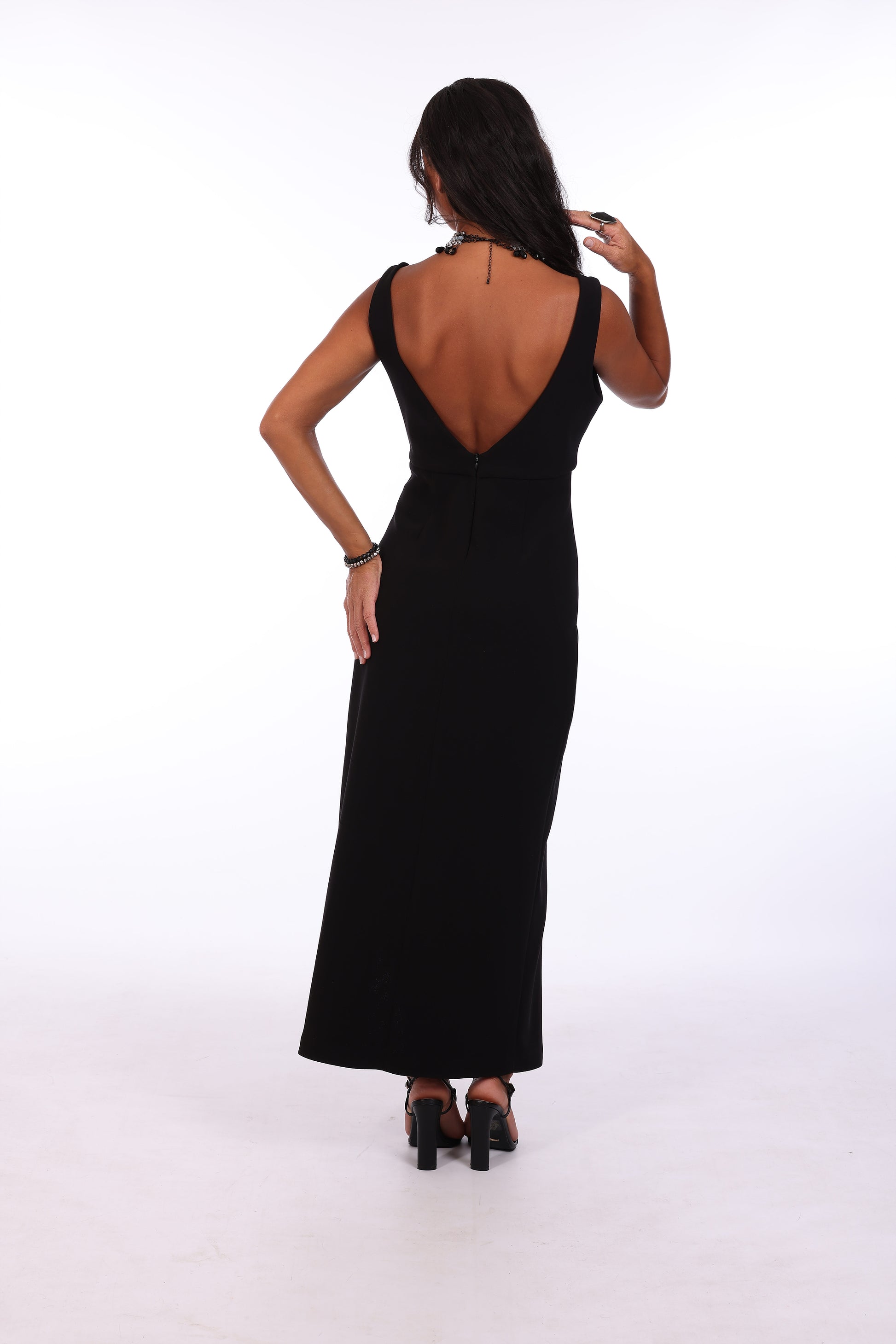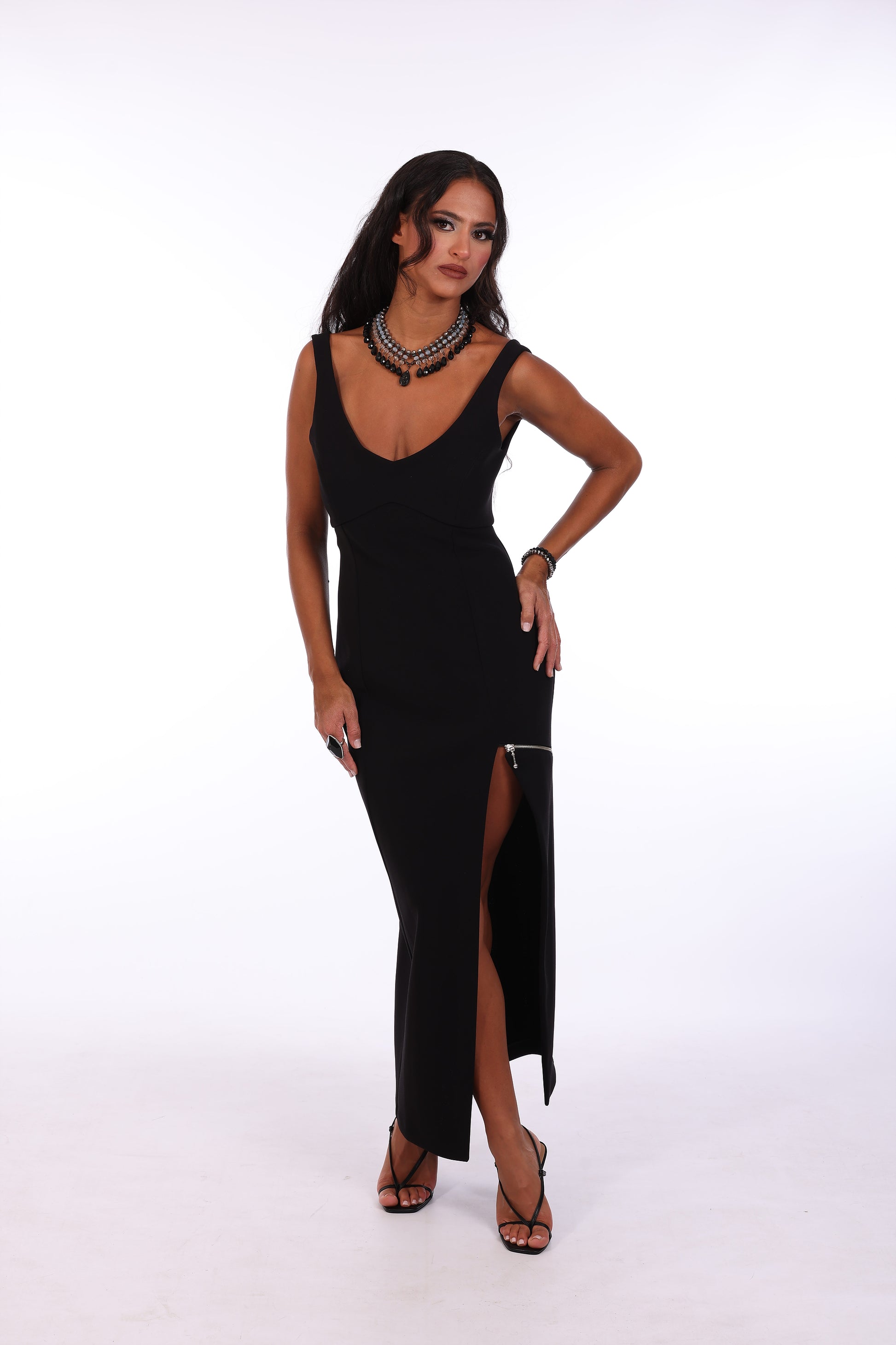 Design is elevated by a modern thigh high slit finished with an exposed zipper that can be open or closed personal preference.