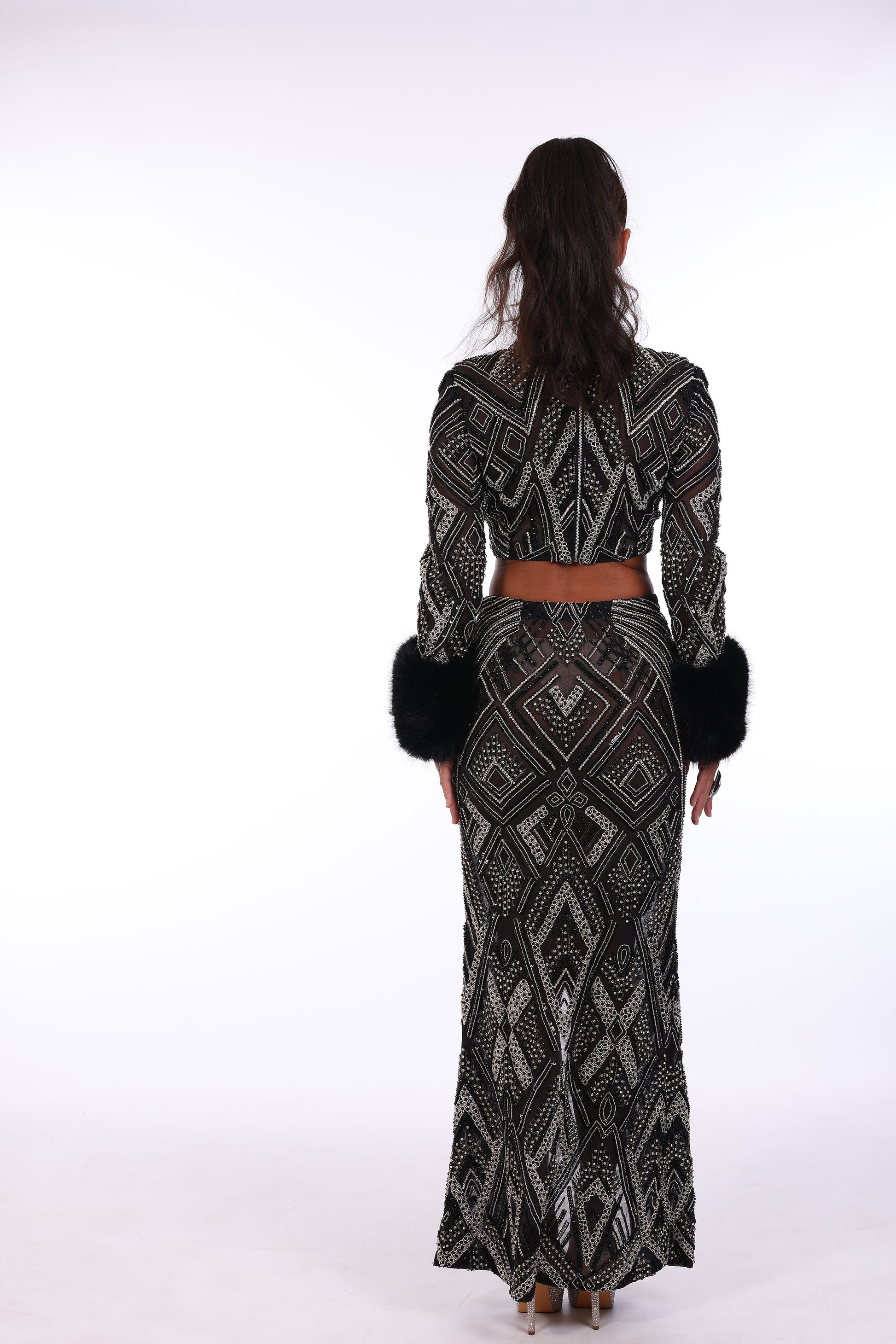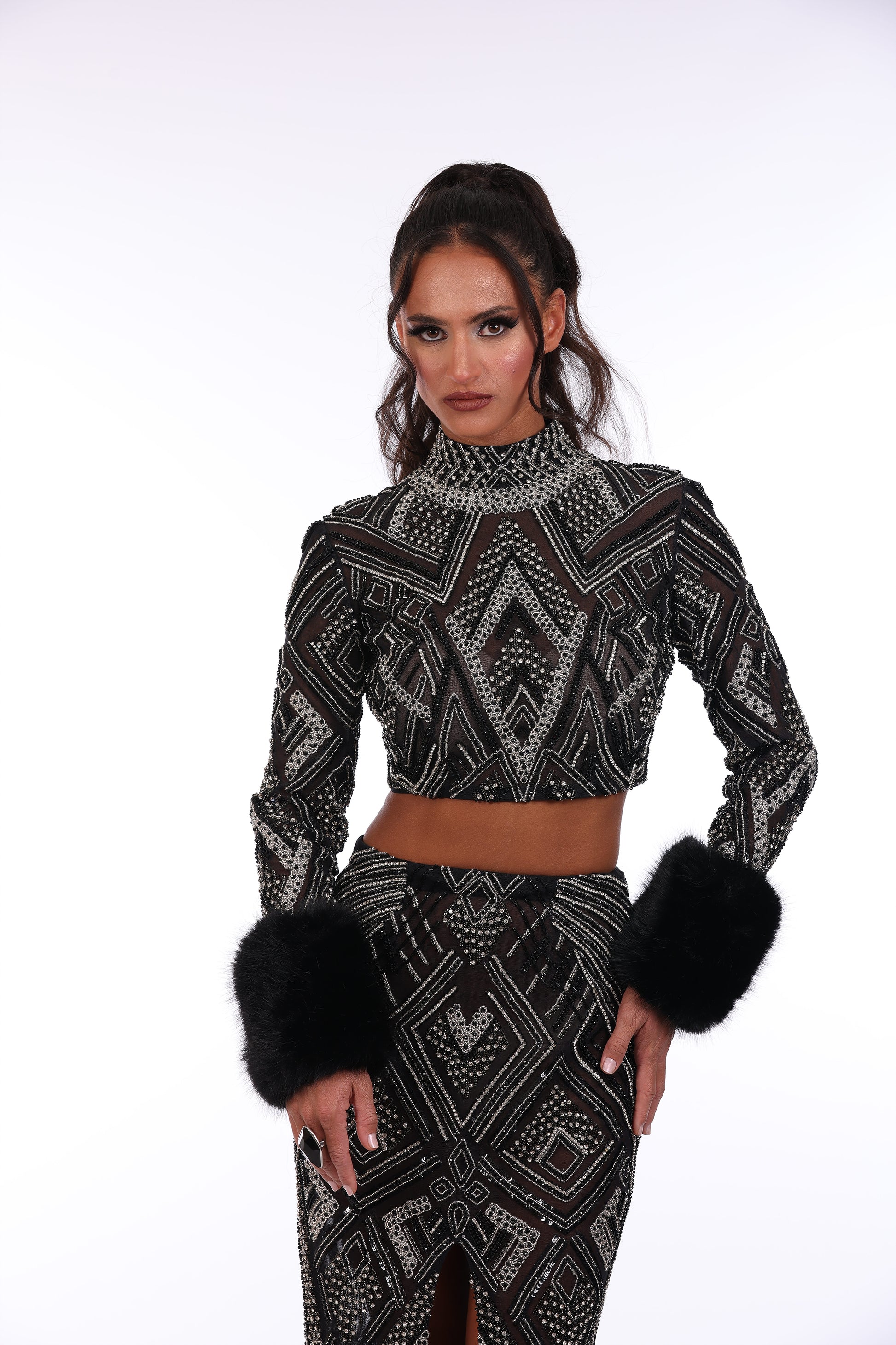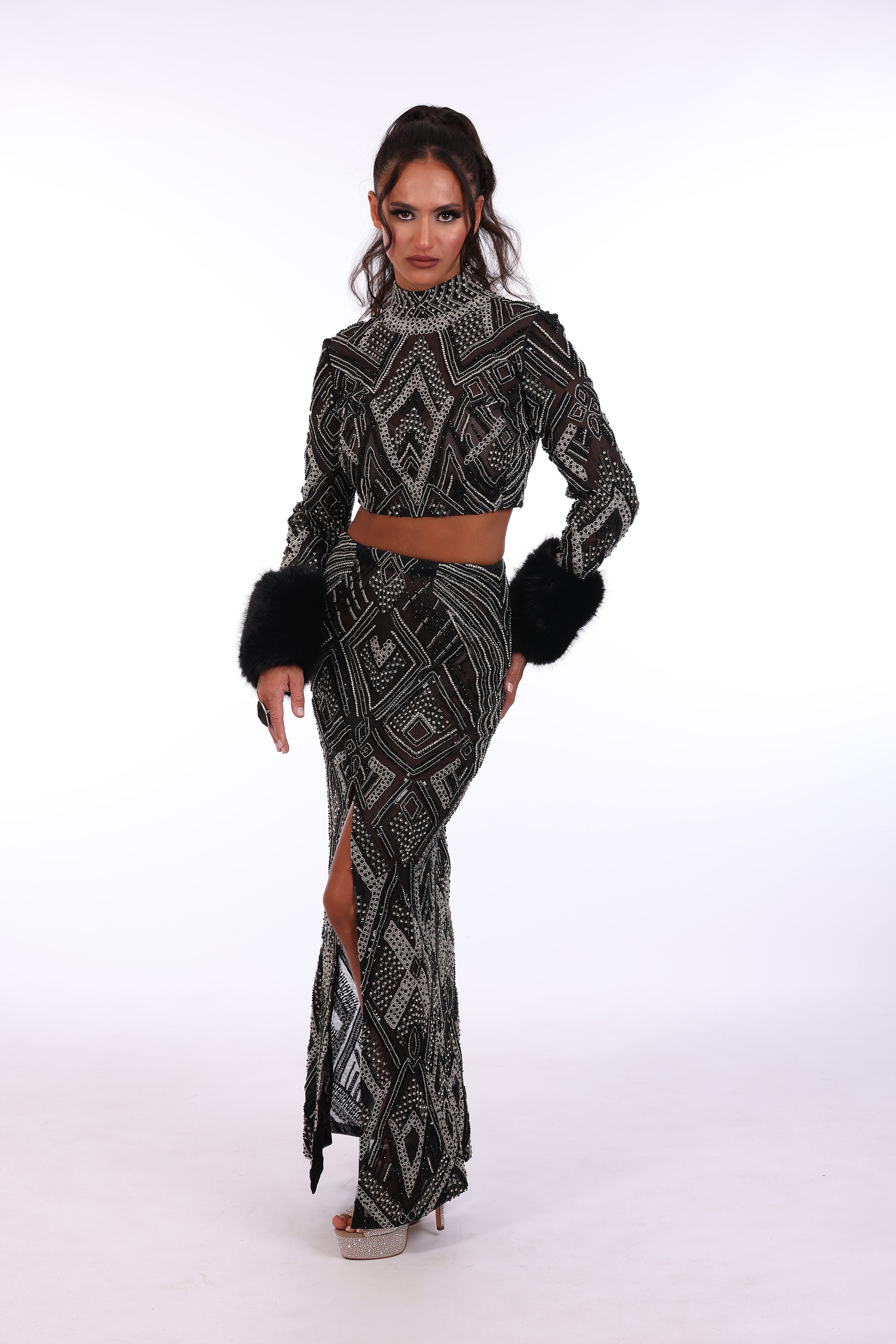 Two piece design features long sleeve cropped top fully beaded wit embellished neckline, paired with co ordinating high waisted skirt.