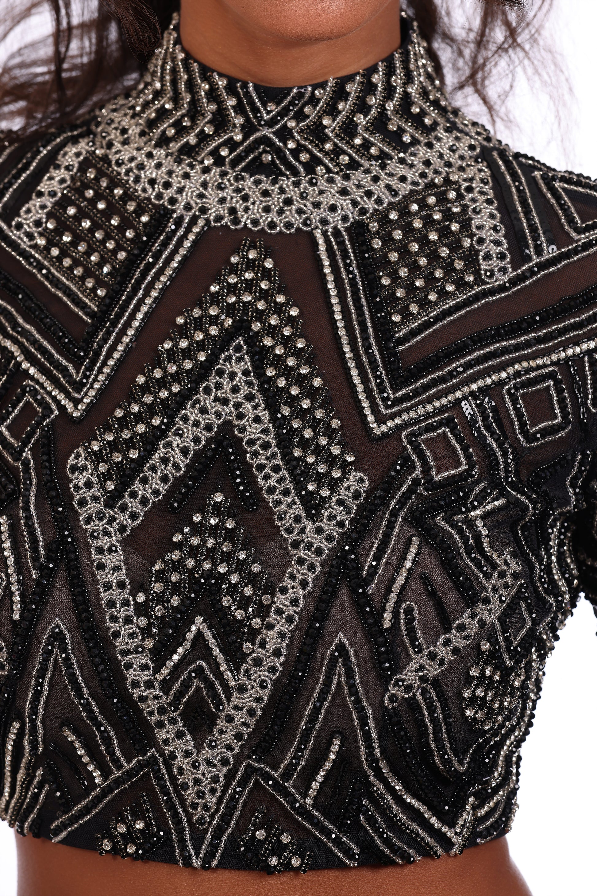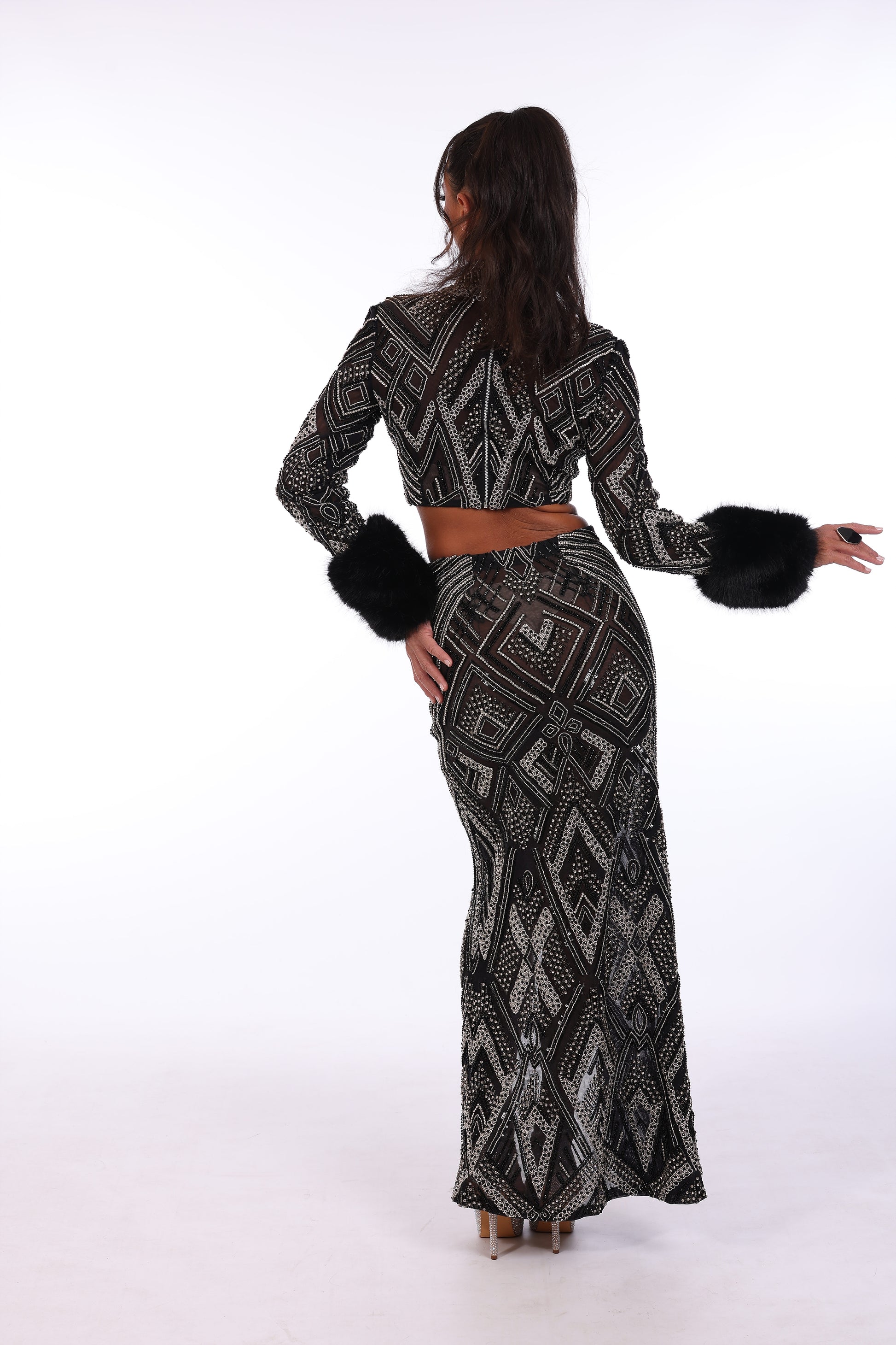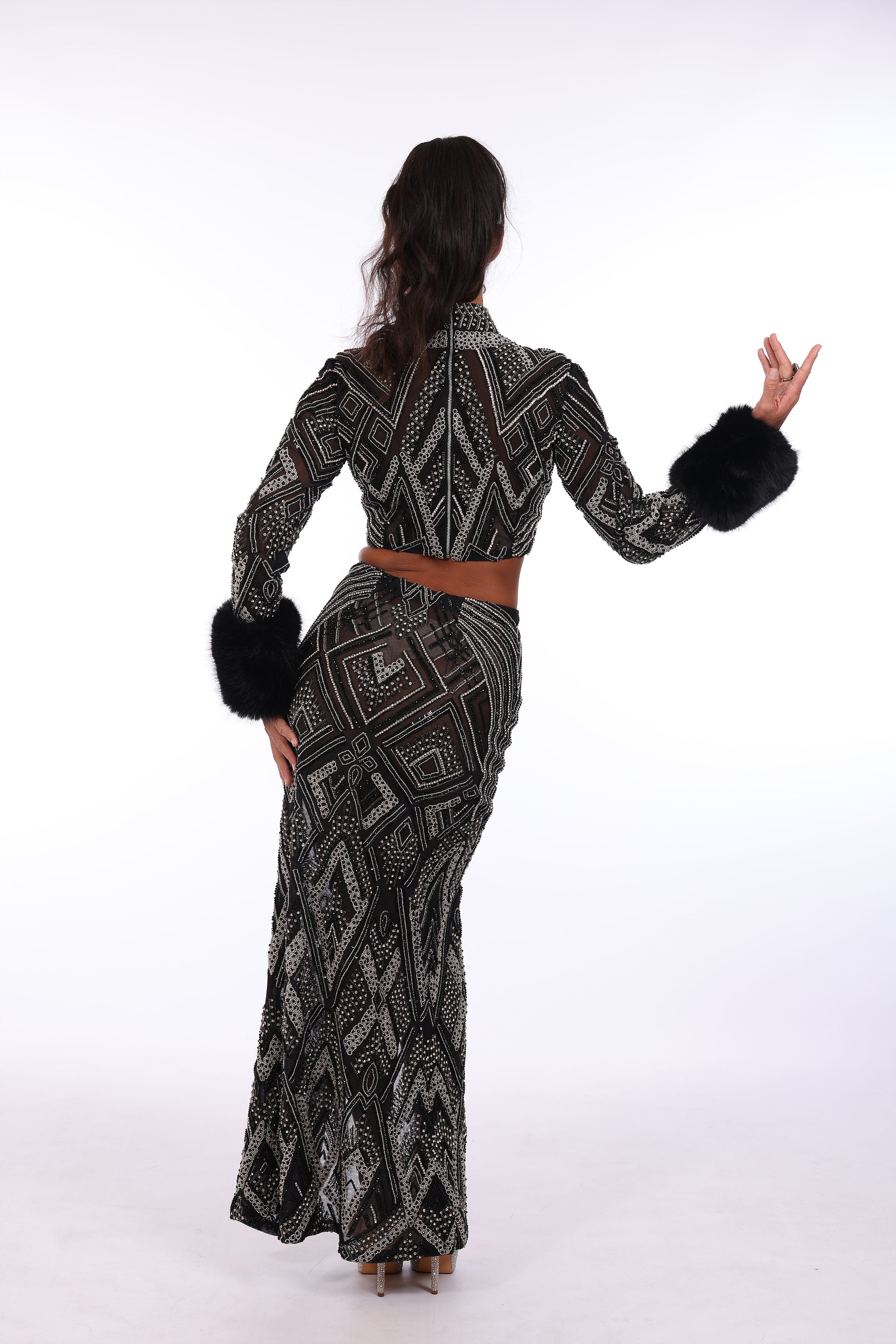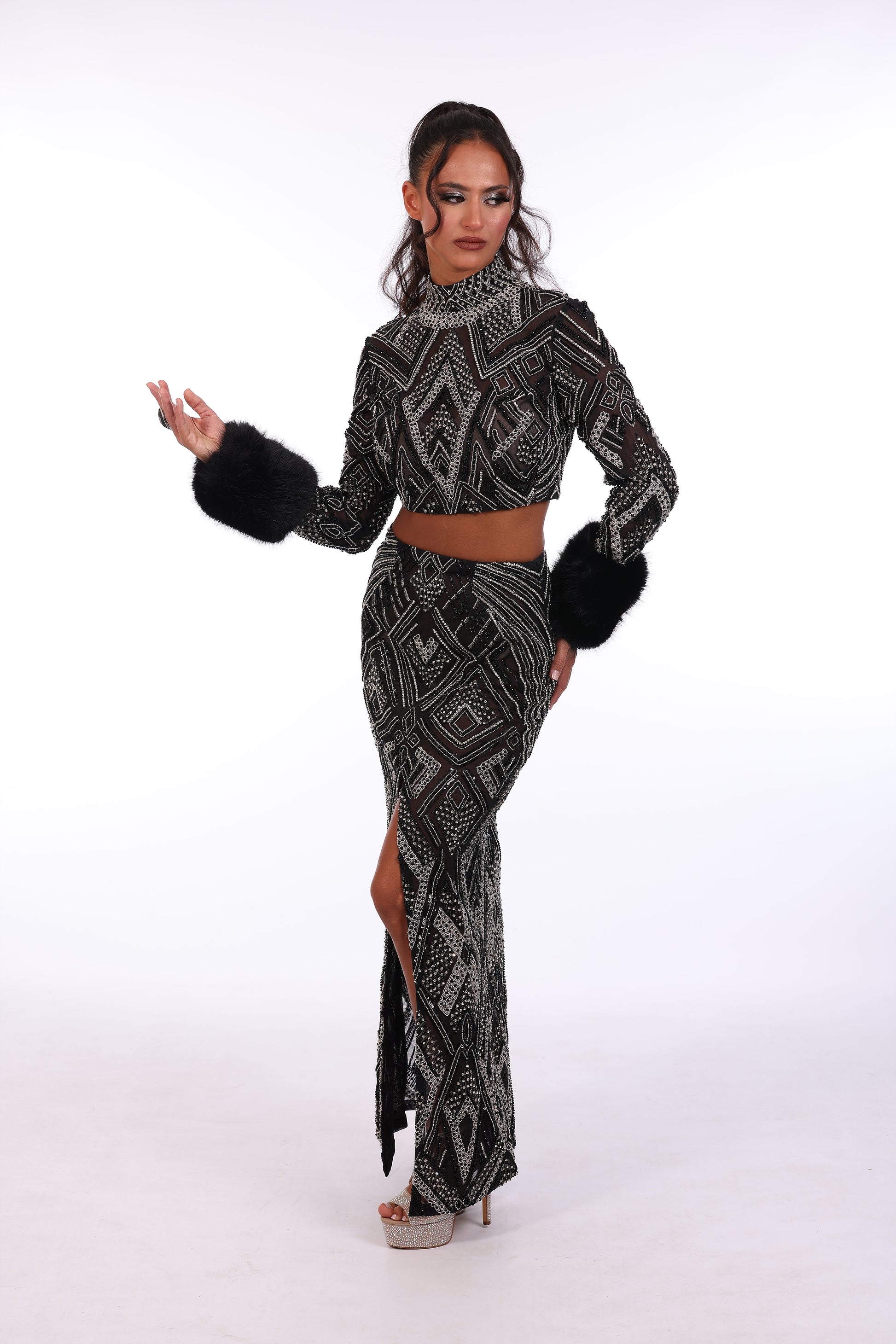 Two piece design features long sleeve cropped top fully beaded wit embellished neckline, paired with co ordinating high waisted skirt.